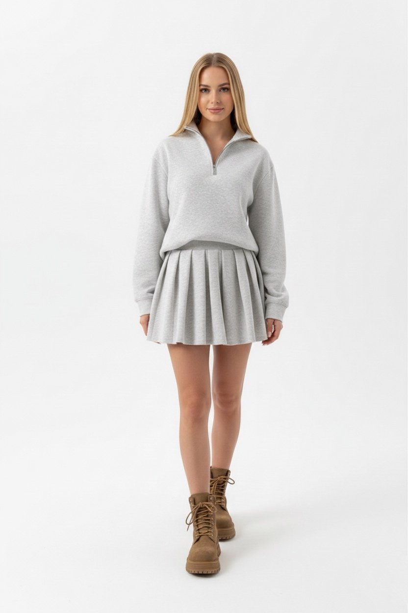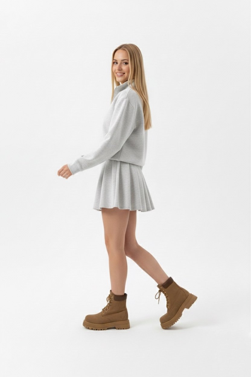 Kostiumėlį sudaro minkštas, malonus megztinis ir derantis sijonas, kurie kartu sukuria harmoningą ir tvarkingą siluetą. Tai praktiškas pasirinkimas vėsesniems sezonams, kai norisi jaukumo, bet kartu išlaikyti estetišką ir išbaigtą išvaizdą. Laikui nepavaldus dizainas leidžia kostiumėlį lengvai pritaikyti tiek kasdieniam dėvėjimui, tiek ramesnėms progoms.